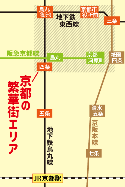 京都の繁華街エリアは、京都駅から電車やバスで10分くらいのところにあります。