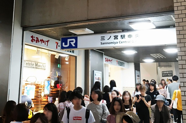 自由通路を左へ約20メートル進むと、JR三ノ宮駅「中央口」改札があります。